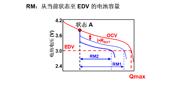 下面介紹的是電池的剩余容量。剩余容量是指當前狀態(tài)放到EDV的電池容量,EDV也就是終止放電電壓。圖中當前狀態(tài)A在一個給定的電流下進行放電,放電到3.0V的時候,對應(yīng)的剩余容量從圖中標出的就是R1。那如果在狀態(tài)A的情況下,同比較大的電流放電,這個時候這個曲線的位置會比開路電壓更低一點,也會比剛才的小電流放電的RM1對應(yīng)的位置更低一點,那這個時候得到的剩余容量是RM2。RM2和RM1對應(yīng)的放電曲線它們的區(qū)別在于使用的放電電流是不一樣的,放電電流越大,曲線的位置越低,剩余容量就越小,所以電池的剩余容量是與放電速率有關(guān)的,不同的電流下面電池的剩余容量是不一樣的。有的用戶在電池的實際使用過程中在放電的情況下,會發(fā)現(xiàn)電池的容量由少變多,他感到不可理解,實際這里可以解釋一下,這種情況是由于放電電流的變化造成的,當我們看到電池容量由少變多的情況,這個通常是由于放電電流突然變小造成的,因為在不同的電流下電池可以放出的容量是不一樣的,當放電電流變小的時候,它可以放出的容量是可以增加的。
