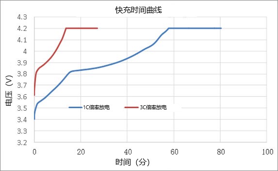 電池高倍率還有一個意義就是能夠進行快充,而普通電池如果進行快充的話易造成負極析鋰,導致電池性能衰減加快,嚴重時可造成電池內部短路,發(fā)生起火爆炸。高倍率電芯3C充滿只需要25min,普通電芯1C充電則需要80min以上,如下圖所示,充電時間可以節(jié)省60%以上。
