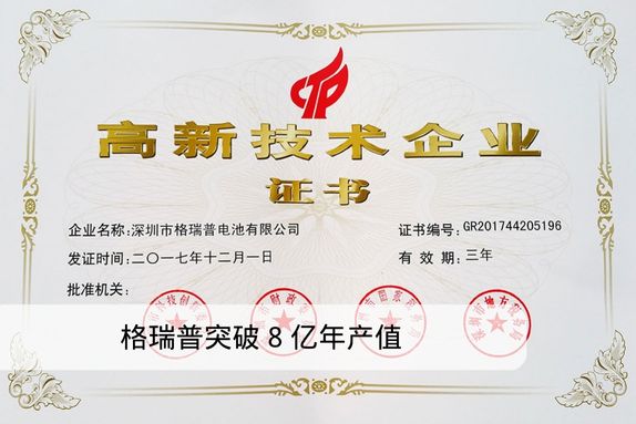 2017年,深圳市格瑞普電池有限公司通過“國家級高新技術(shù)企業(yè)”、“深圳市高新技術(shù)企業(yè)”復審,突破8億年產(chǎn)值!